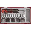 Sats om 64 delar. Består av ledbar bitsspärrskruvmejsel, adapter 1/4" x 1/4", 11 st 1/4" hylsor och 51 st 25 mm långa bits. Levereras i inbyggnadslåda av plast med löstagbart lock. Passar i Teng Tools verktygslådor och montörvagnar.