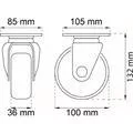 Svängbart containerhjul av stål. Hjul av PUR (polyuretan) Med totalbroms som låser även rotation av hjulchassie. Hjuldiameter 100 mm. Fästplatta 105x85 mm. Maxbelastning 160 kg per hjul (beräknat värde, garanteras inte).