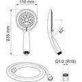 Duschpaket med en handdusch och 1,5 meter duschslang. Handdusch med tre stråltyper, diameter duschhuvud 110 mm. Med antikalkfunktion. Rubber Clean-gummi på munstycket gör att det är enkelt att avlägsna kalk. Passar alla blandare och duschslangar, G1/