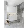 Nischdusch med en rak duschdörr och en fast vägg båda i frostat glas. Duschlösningen är anpassad för nischöppning och monteras mellan fasta väggar. Duschen är stabilt med väggprofiler i eloxerad aluminium som kan monteras med skruv eller limbrickor. Den har en patenterad lösning för enkel installation och justering, Hafa's InstaQuickT. Dörren har lyftgångjärn för att den inte skall ta i golvet vid öppning och är vändbar så du kan välja om den skall placeras till höger eller vänster. Duschstången kan monteras på tre sätt: mot vägg, mot tak eller i vinkel mot samma vägg som duschväggen monteras. Dörren har 6 mm härdat säkerhetsglas och kan monteras med utanpåliggande rör, 35 mm. Väggen har 8mm härdat säkerhetsglas och förlängningsprofil kan köpas till för utanpåliggande rördragning. Höjd 2000 mm. 18 mm släplist, magnetlist och handtag ingår. Dörren kan kompletteras med en eller flera förlängningsprofiler för att anpassas till nischens mått.