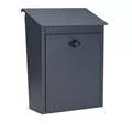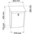 Låsbar postlåda av pulverlackerad galvaniserat stål. Levereras med 2 nycklar. Kan även användas olåst. Höjd 400 mm. Bredd 270 mm. Djup 130 mm. Lockets mått 302x202 mm. Brevinkastets mått 250x30 mm. Rymd 12,5 liter. Design Jerker Andersson.