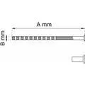 Klippbar skruv med hylsmutter för dörrhandtag. Passar det rostfria sortimentet med dold fastsättning. Användes tillsammans med roddarpinne 1 (art. nr. 20831) då dörrtjockleken överstiger 70 mm. Gänga M4. A=längd, B=tjocklek.